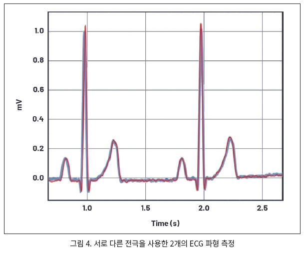 그림 4는 2개의 ECG 파형을 보여준다. 파란색 파형은 양호한 품질의 전극을 사용해서 측정한 것으로서, 직렬 임피던스는 51kΩ이고 커패시턴스는 47nF이다. 빨간색 파형은 불량한 품질의 전극을 사용해서 측정한 것으로서 직렬 임피던스가 높다. 접촉 임피던스는 510kΩ이고 커패시턴스는 4.7nF이다. 여기서 ADPD4000은 전극 품질에 상관없이 두 파형을 거의 동일하게 측정하고 있다는 것을 알 수 있다. 이것은 시중의 다른 솔루션들과 비교할 때 이 AFE가 제공하는 가장 큰 장점이다.