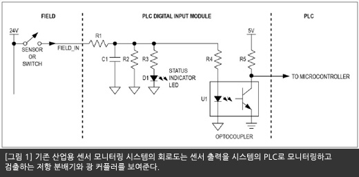 디지털/바이너리 센서와 스위치는 산업 제어, 산업 자동화, 모터 제어 및 공정 자동화에서 신호 모니터링과 시스템 제어에 필수적이다. 모든 센서의 출력은 중앙처리장치(CPU)에 의해 검출되고 모니터링되어야 할 필요가 있다. 이를 수행하기 위해 일반적으로 프로그래밍 로직 컨트롤러(PLC)의 디지털 입력 모듈에 있는 두 개의 고전력 저항 분배기가 센서의 출력 전압을 검출한다. 각 센서 채널을 절연하는 데에는 각각의 광 커플러가 필요하다. 산업 시스템의 복잡한 정도에 따라 일반적인 동작 중에 많은 광 커플러가 동시에 필요할 수 있다(그림 1).