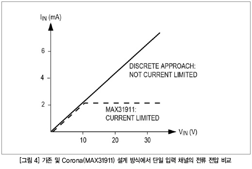 집적화가 답이다. 말이나 계획은 쉽지만 실행은 간단하지 않다. 우선 채널 입력을 증가시켜 시스템 성능을 확장하면서도 인터페이스는 단순하게 유지해야 한다. 다음으로 데이터 직렬화에 관심을 돌려 절연에 사용되는 광 커플러를 제거하는 방법을 찾아보아야 한다. 그리고 구성 가능한 전류 제한을 사용하여 전력 소모를 낮출 수 있다(그림 4 참조). 오류 검출을 향상시키고 동일한 단순 인터페이스에서 데이터 전송의 신뢰성을 높게 유지한다. 이러한 모든 기능을 통합하면 디지털 입력을 훨씬 더 다방면에서 견고하게 만들어 발열과 전력, 공간을 줄이고 비용은 많이 낮출 수 있다. 그것이 우리의 목표이다.