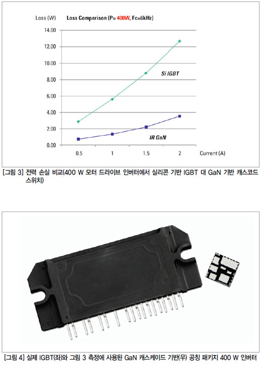 낮은 온상태(on-state) 순방향 전압 강하와 동시에 큰 폭으로 줄어드는 스위칭 전하(switching charge)의 조합은 전력 처리 성능을 3~4배 개선시켜 준다(그림 2에서 보여주는 것과 같이 감소된 전도 손실*스위칭 손실의 형태). 소자의 이러한 향상된 성능은 모터 드라이브 인버터 사용 환경에서 높은 효율성을 보여준다. 그림 3이 보여주듯, 모터 드라이브 인버터와 관련 있는 전력 손실은 전형적인 기기 사용 환경에서는 공칭 400 W이며, 이는 IR의 600 V급 GaNpowIR짋 소자와 최첨단 실리콘 기반 트렌치 IGBT을 비교했을 때 3배 이상 전력 손실이 감소된 수치이다.