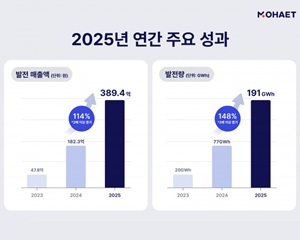 에이치에너지가 모햇이 ‘2025년 결산 지표’를 공개하고 발전량과 발전 매출액이 전년 대비 큰 폭으로 증가했다고 1월 20일 밝혔다. 결산에 따르면 2025년 연간 조합 참여금은 1770억원으로 전년 대비 34% 증가했다. 출범 이후 누적 조합 참여금은 4200억원을 넘어섰으며, 회원 수는 21만 명을 돌파했다. 운영 실적도 크게 늘었다. 2025년 연간 발전량은 191GWh로 전년 대비 148% 증가했으며, 발전 매출은 389억원으로 전년 대비 113% 확대됐다.