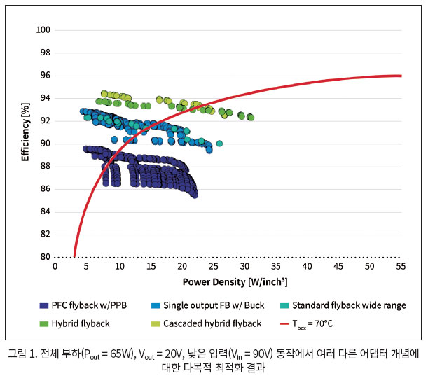 최적화 결과는 그림 1에 최악의 조건 입력 전압(Vin = 90VAC)과 최고 출력 전류(Iout = 3.25A)에서 전체 부하 동작에 대해 나와 있다. 또한 열 제한선을 볼 수 있다. 이 선은 어댑터의 표면 온도를 70°C 미만으로 유지하기 위해 주어진 전력 밀도에 필요한 최소 효율을 정의한다.