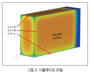 단순화를 위해 컨버터는 일정한 전력 소모를 갖는 고체 구리 블록으로 모델링하고 시뮬레이션하였다. 그림 3은 사용된 모델을 보여준다. 여기에서도 65W의 출력 전력이 선택되었기 때문에 허용되는 최대 케이스 온도는 70 °C로 제한되었다.