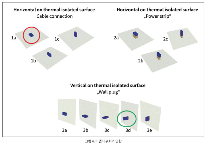 어댑터를 벽면 플러그에 직접 꽂으면(위치 3d) 가장 많은 양의 열을 제거할 수 있는 것으로 나타났다. 만약 어댑터를 위치 1a에 따라 데스크 위에 놓는다면 최악의 경우가 된다. 위치 3d는 위치 1a보다 약 20% 더 많은 열을 제거할 수 있다.