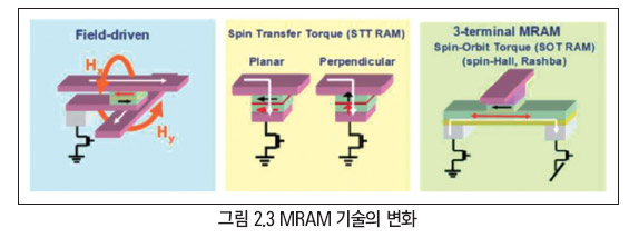 하지만 최근 들어 STT-MRAM은 전력 소모 측면에서 한계가 들어나고 있다. 현재의 소재와 구조에서는 300 fJ 이하로는 전력 소모를 낮출 53수 없을 것으로 예상되고 이를 해결하기 위해 세계 유수의 대학과 연구소에서 스핀-궤도-토크(SOT)를 이용한 소자 개발관련 연구가 주목을 받고 있다(그림 2.3).