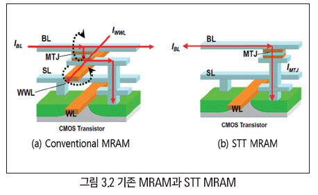 MTJ 셀의 크기가 작아질수록 자화 반전에 저항하는 힘이 커지게 되어 자화를 반전시킬 때 더 큰 전류가 필요하므로 메모리 집적이 쉽지 않다. 이 점을 극복하기 위해 스핀 전달 토크를 이용한 소자에 대한 연구가 진행중이다. 그림 3.1(b)는 STT MRAM의 구조를 나타낸다. 그림 3.1(b)에서 정보를 읽을 때는 기존 MRAM과 동일하게 자화 방향에 따른 저항 차이에 따라 1과 0을 판단한다.