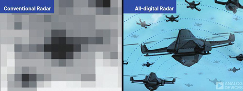 ‘소자 수준에서 디지털을 구현’하면 모든 안테나 (소자) 뒤에 강력한 데이터 컨버터 칩을 사용함으 로써 완전 디지털 감지의 비약적 향상이 가능해진 다. 대규모 완전 디지털 위상배열 레이더 시스템은 20,000개에 달하는 안테나 소자를 탑재할 수 있으 며, 수천 개의 데이터 컨버터를 필요로 한다. 맥코드는 “AD9371의 높은 통합 수준은 소자 수준에서 완전한 디지털을 구현할 수 있게 했다”고 하면서 “이전 같았으면 크기와 비용이 너무 커서 소형 데이터 센터 수준의 공간과 수많은 케이블이 필요했을 것이다.
