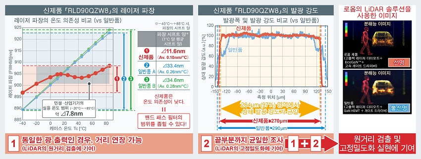 로옴은 LiDAR의 장거리 대응 및 고정밀도화에 기여할 수 있는, 레이저의 좁은 발광폭을 실현한 독자적인 특허 기술을 확립했다. 2019년에 25W레이저 다이오드 「RLD90QZW5」, 2021년에 75W레이저 다이오드 「RLD90QZW3」을 개발했고, 이번에 한층 더 높아지는 고출력화 요구에 대응하여 120W 출력이 가능한 신제품을 개발했다.