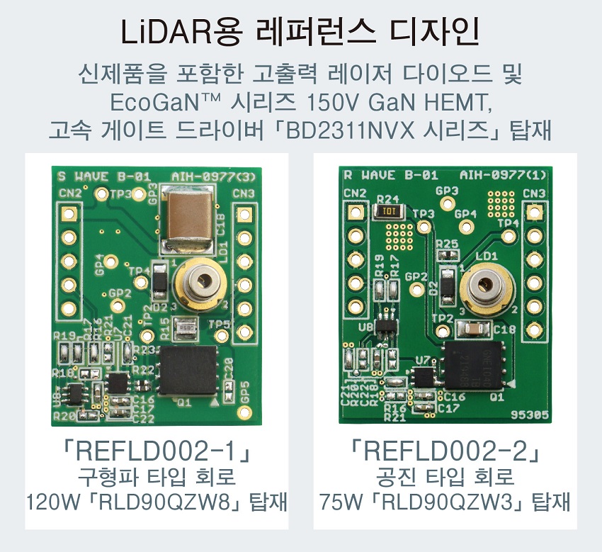 로옴은 신제품의 평가 및 도입에 필요한 다양한 설계 데이터를 로옴 공식 Web 상에서 공개하여, 신속한 도입을 서포트하고 있다. LiDAR 용도에서의 레이저 다이오드 구동을 위해서는 나노초의 고속 스위칭도 필요하다. 로옴은 EcoGaN™ 시리즈의 150V GaN HEMT 및 게이트 드라이버를 조합한 레퍼런스 디자인 「REFLD002」도 로옴 공식 Web에서 공개하고 있다.