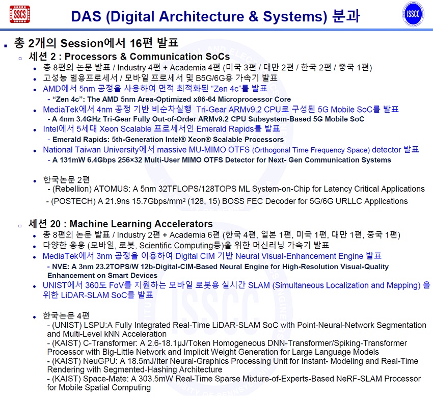 DAS 분과에서는 총 16편의 채택 논문 중 우리나라가 6편의 논문을 채택시켰다. 리벨리온과 POSTECH, UNIST가 각 1편, 나머지 3편은 KAIST 논문이다. UNIST는 360도 FoV를 지원하는 모바일 로봇용 실시간 SLAM (Simultaneous Localization and Mapping)을 위한 LiDAR-SLAM SoC를 발표할 예정이다.