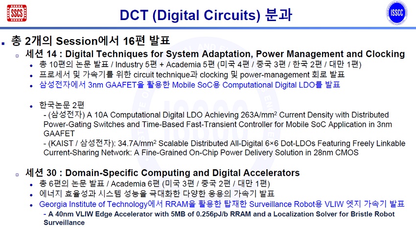 DTC(Digital Circuits) 분과는 총 2개의 세션에서 16편의 논문이 발표된다. 우리나라는 2편의 논문을 채택시켰다. 그중 삼성전자는 3nm GAAFET을 활용한 Mobile SoC용 Computational Digital LDO를 발표할 예정이다.