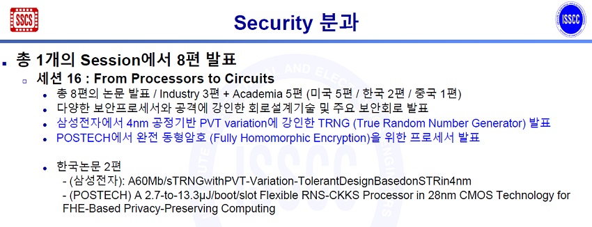 이번에 신설된 시큐리티 분과에서는 총 8편의 논문이 발표된다. 그중 삼성전자와 포스텍(POSTECH)이 각각 1편의 논문을 채택시켰다. 이 세션에서 삼성전자는 4nm 공정 기반 PVT variation에 강인한 TRNG (True Random Number Generator)를 발표하고, 포스텍은 완전 동형 암호(Fully Homomorphic Encryption)을 위한 프로세서를 발표할 예정이다.