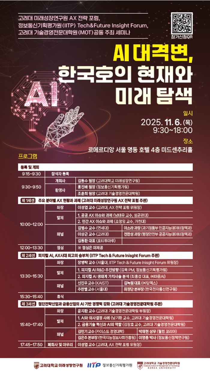 고려대학교 미래성장연구원(원장 김동수) AX 전략 포럼과 고려대학교 기술경영전문대학원(원장 조훈희)은 정보통신기획평가원(IITP) Tech&Future Insight Forum과 공동으로 11월 6일(목) 르메르디앙 서울 명동 호텔에서 ‘AI 대격변, 한국호의 현재와 미래 탐색’을 주제로 공개 세미나를 개최한다.