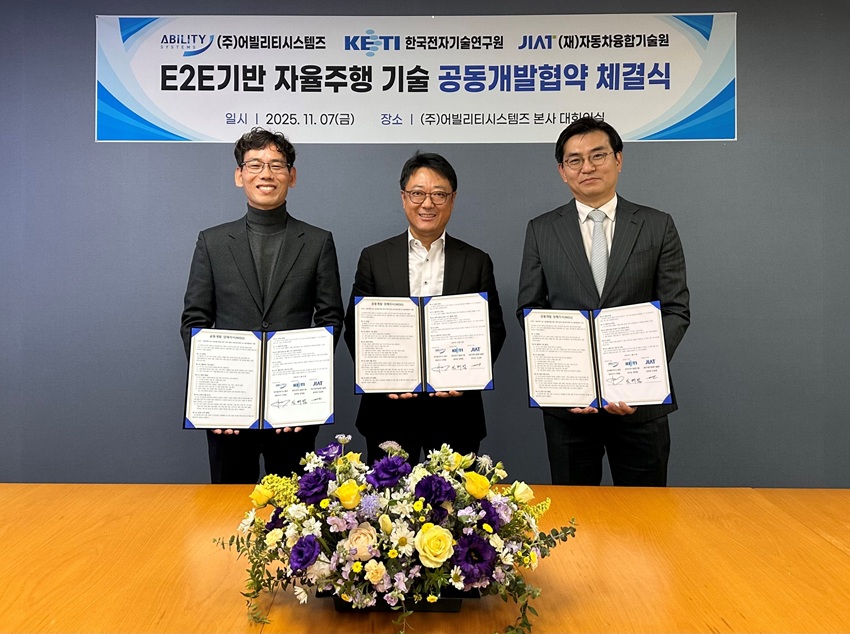 어빌리티시스템즈는 한국전자기술연구원(KETI) 인공지능연구본부, 자동차융합기술원 모빌리티연구본부와 7일 어빌리티시스템즈 본사에서 E2E 기반 자율주행 기술의 연구개발 및 실증을 공동으로 추진하기 위한 업무협약(MOU)을 체결했다고 13일 밝혔다.