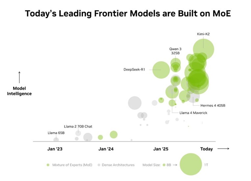 이러한 장점 덕분에 MoE가 최첨단 모델의 선호 아키텍처로 급부상한 것은 당연한 결과이다. 올해 공개된 오픈소스 AI 모델의 60% 이상이 이를 채택했다. 2023년 초 이후 MoE는 모델 지능을 약 70배 향상시켜 AI 능력의 한계를 확장해 왔다.