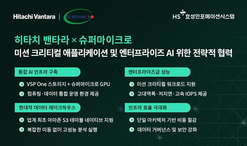 HS효성인포메이션시스템(대표 양정규)은 히타치 밴타라(Hitachi Vantara)가 AI·클라우드·스토리지·5G/엣지 분야의 종합 IT 솔루션 기업 슈퍼마이크로(Supermicro)와 전략적 파트너십 체결을 추진한다고 밝혔다.