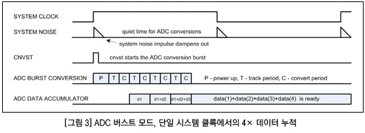 실리콘 랩스의 MCU 제품에서 특히 유용한 두 기능은 버스트 모드(burst mode)와 사후 추적 모드(post-track mode)이다. 버스트 모드는 한 변환 요청으로부터 모두 트리거되는 연속적인 ADC 변환의 프로그래밍 가능한 숫자로부터 누적된 평균 결과를 생성한다. 사후 추적 모드는 변환 시작 요청의 작업을 변경하여 MCU 시스템으로부터 필요한 추적 시간 관리를 오프로드한다. 일반적으로 변환 시작은 추적 기간의 끝과 변환 기간의 시작 지점을 표시한다. 하지만 사후 추적 모드에서 변환 시작 요청은 추적 기간의 시작을 알리고, 이 추적 기간이 미리 구성된 SARADC 클록 기간을 기준으로 프로그래밍 가능한 시간 동안 진행된 후에 변환이 시작된다. 사후 추적이 있는 버스트 모드는 저주파수에서 실행되는 MCU에 대해 단일 MCU 클록 사이클 내에서 누적 ADC 결과를 달성할 수 있으므로, 그림 3과 같이 시스템 사이클 및 에너지를 절약한다.