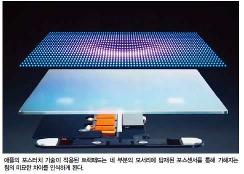포스터치가 적용된 트랙패드는 네 부분의 모서리에 탑재된 포스센서를 통해 사용자의 힘에 반응하게 된다. 사용자가 가하는 힘의 미묘한 차이를 인식해 여러 앱에서 다양한 기능을 수행한다.