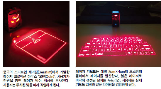레이저를 이용한 다양한 제품이 출시되는 가운데, 평평한 바닥이면 어느 곳이든 키보드로 만들 수 있는 레이저 키보드는 대략 8 cm × 4 cm × 2 cm의 초소형을 특징으로 하고 있다. 하지만 현재까진 실제 타수와 인식하는 시간 사이에 약간의 차이가 있는 편이다. 또한 손가락에 전해지는 촉감이 없기에, 사용자가 어떤 글자를 타이핑하는지 역시 쉽게 인식되지 않는다.