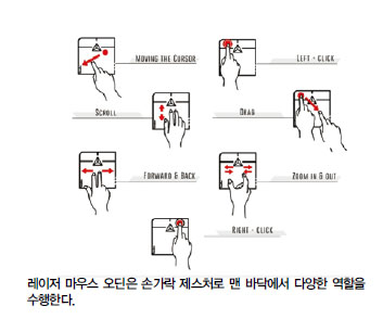 사용자가 전원을 켜면 레이저 빔이 책상에 투사된다. 사용자는 투사된 빛을 따라 작업하게 된다. 4 cm x 5 cm의 크기와 두께 2 cm로 인해 뛰어난 휴대성을 갖췄다. 무게는 40 g에 불과하다. 기존의 마우스가 장시간 이용 시 손목과 접합되는 부위에 부담을 줘 손목 터널 증후군을 발생시킬 수 있었다면 이 마우스는 손목과 마우스 간에 경사면이 없기에 장시간 사용이 가능하다.