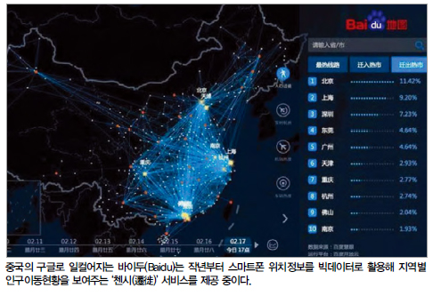작년부터는 스마트폰 위치정보를 빅데이터로 활용, 1시간 단위로 지역별 인구이동 현황을 보여주는 ‘첸시(遷徙)’ 서비스를 중국의 국영방송 CCTV에 제공하고 있다. 바이두는 실리콘밸리의 인공지능 연구소, 딥러닝 연구소(IDL), 베이징의 빅데이터 연구소를 통해 영향력을 지속적으로 강화 중이다.