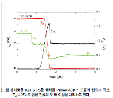 이 새로운 IGBT 기술을 평가할 때 또 다른 중요한 점은, 적절한 소프트 스위칭 동작을 제공한다는 점이다. 그럼으로써 EMI 친화적 동작을 가능하게 한다. 그림 3은 실온으로 공칭 전류의 두 배 이상을 처리하면서 스위칭이 매우 빠르게 이루어질 때 IGBT5 PrimePACK의 턴오프 곡선을 보여준다.