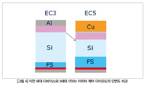 Tvj,op가 25K 높아짐에도 불구하고 서지 전류 용량은 떨어트리지 않도록 하기 위해서, 이 차세대 다이오드 역시 그림 4에서 보는 것과 같이 상단면에 후막 구리 금속층을 적용하고 있다[2].