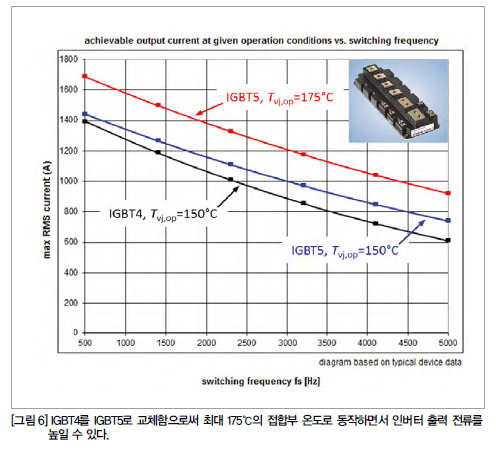 이러한 디바이스 차원의 데이터를 살펴봤을 때, 새로운 1700V IGBT5-P5를 사용함으로써 동일한 모듈 풋프린트로 최대 인버터 출력 전류를 높일 수 있다는 것을 알 수 있다.