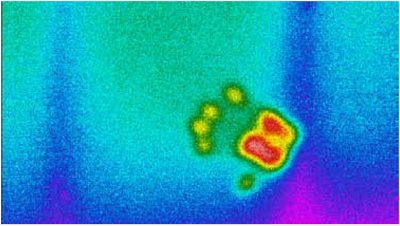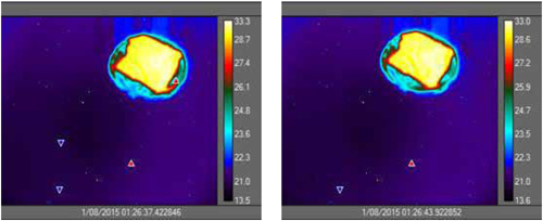 그림 2의 열화상은 냉각식과 비냉각식 열화상 카메라로 각각 가능한 최대의 확대 배율로 촬영한 결과이다. 왼쪽 이미지는 4배 클로즈업 렌즈를 사용하는 15μ 피치 냉각식 카메라로 3.5μm 스팟 사이즈를 구현한 것이다. 오른쪽 이미지는 1배 클로즈업, 25μ 피치 비냉각식 카메라로 25μm 스팟 사이즈를 구현한 것이다.