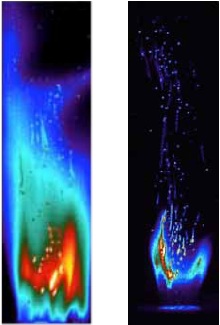 이와 같은 화염을 ”투시하는“ 스펙트럼 적외선 필터를 사용하면 화염이 투명하게 나타나는 파장대역만을 선택하여 석탄입자가 연소하는 것을 볼 수 있다. 첫째 이미지는 화염 필터를 사용하지 않아서 화염 밖에 보이지 않는다. 둘째 동영상은 화염 필터를 사용하여 석탄입자가 연소하는 것을 볼 수 있게 한 것이다.