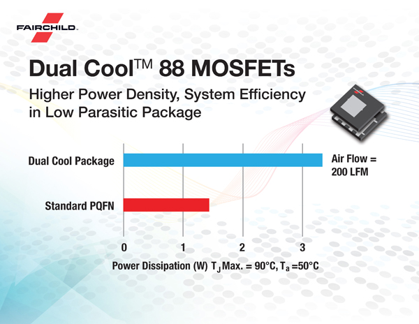 고성능 반도체 솔루션의 세계적인 공급업체인 페어차일드(NASDAQ: FCS)가 오늘 듀얼 쿨 8mm x 8mm 패키지로 제공되는 업계 최고의 중전압 MOSFET 기술을 발표했다. 전력 변환 엔지니어들에게 부피가 큰 D2-PAK 패키지에 대한 최초의 대안을 제공하는 새 Dual Cool 88 MOSFET은 절반의 크기로 패키지 상단과 하단의 기류를 통해 더 높은 전력 밀도, 뛰어난 효율성, 더 우수한 냉각 특성을 실현해 준다.