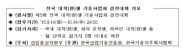 창의적인 사업 아이디어와 대학·연구소의 기술을 결합하여 대학(원)생들의 신규 창업을 촉진하기 위한 ‘제5회 전국 대학(원)생 기술사업화 경진대회’가 열린다.