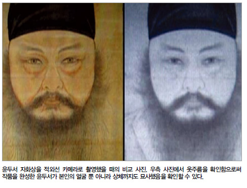 적외선 카메라로 이 비밀을 밝혀낼 수 있다. 그림을 찍어보자. 옷깃과 옷주름이 나타나는 것을 확인할 수 있다. 완성된 작품이었으나 오랜 세월이 흐르면서 퇴화된 것이다.
