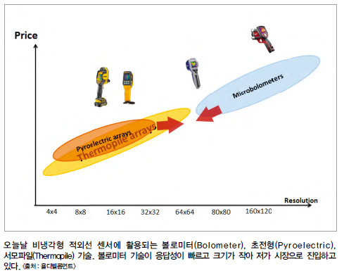 핵심은 ‘저가격 실현’과 ‘크기의 감소’다. 적외선 센서 특성상 크기가 줄면 성능은 저하될 수밖에 없기에 크기를 줄이면서 동일한 성능을 유지할 수 있는 기술 개발이 핵심 이슈가 될 것으로 본다.