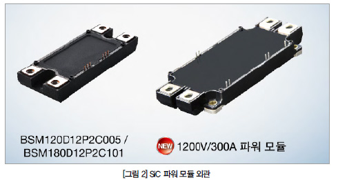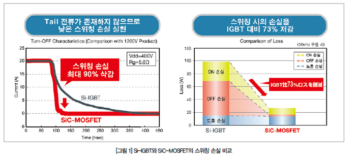 1000 V를 초과하는 내압의 MOSFET 소자는 실리콘 반도체로는 도통 손실이 낮은 소자를 제작하기 어려웠으나, SiC 반도체로는 가능하다. 또한 고내압 스위칭 소자로서 널리 사용되고 있는 Si-IGBT에 비해 스위칭 손실이 1/5 정도이므로, 구동 주파수의 고주파화를 통한 기기의 소형화(필터, 냉각기구)와 전력 변환 효율 향상에 대한 효과를 기대할 수 있다(그림 1).
