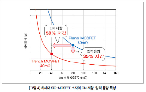 기존에 양산중인 SiC-MOSFET에 비해, 동일 소자 사이즈의 경우 도통 손실(ON 저항을 약 50% 삭감) 저감, 스위칭 성능(입력 용량을 약 35% 저감) 향상을 실현했다(그림 4).