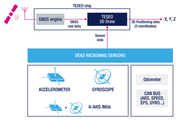 ST의 다중 위성항법 위치추적 칩을 위한 펌웨어 테세오 드로우는 위성신호 수신이 미약하거나 전혀 없는 터널 내부, 지붕이 있는 주차장이나 다층 고속도로와 같은 곳에서도 내비게이션 장치가 지속적이고 정확한 위치를 찾고, 방향전환(turn-by-turn)안내를 하도록 해준다. 또한 기존 내비게이션 시스템에서는 정확도가 떨어지는 도심 밀집 지역과 같은 곳에서의 성능도 개선됐다.