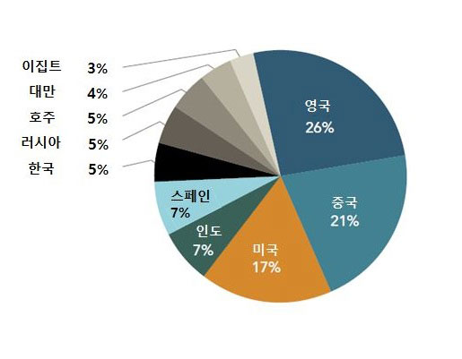 한국에서 발생한 디도스 공격은 전체 5%로 2분기와 마찬가지로 공격 발생 국가 순위 6위에 이름을 올렸다. 2분기 전세계 디도스 공격 2위였던 영국이 27%을 기록하며 1위에 올랐고, 2분기 1위였던 중국은 21%로 2위를 차지했다. 미국(17%), 인도(7%), 스페인(7%)이 그 뒤를 이었다.