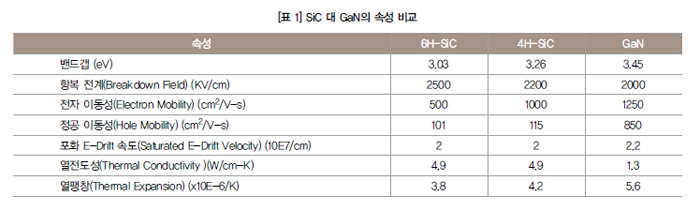 표 1은 SiC 대 GaN의 속성을 특성 면에서 구분한 것이다. SiC는 다양한 크리스털 구조를 가지고 있어서 단지 공통적인 것만 보여주고 있다.