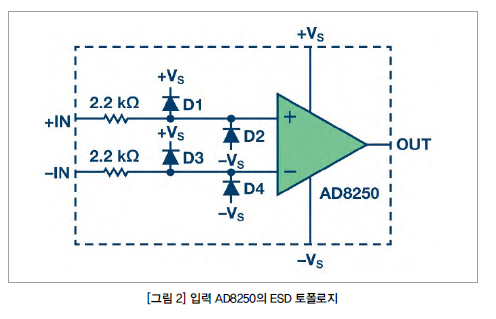 그림 2의 증폭기는 그림 1과 비슷한 다이오드 구성을 사용하지만, 이 경우 전류는 2.2 kΩ의 내부 직렬 저항에 의해 제한된다. 이렇게 구성하면 전류를 제한하는 R의 값에 따라 그림 1의 회로와 구별할 수 있을 뿐 아니라 2.2 kΩ의 저항이 +Vs보다 큰 전압으로부터 회로를 보호한다는 점에서도 그림 1과는 차이가 있다. 이는 복잡하지만 ESD 다이오드를 사용할 때 최적화된 과전압 보호를 제공하기 위해 충분히 이해해야 하는 복잡한 사항 중 하나이다.