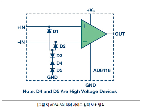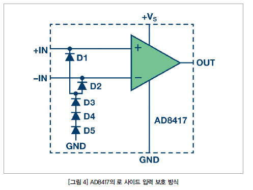 테스트 장비 혹은 계측 및 센싱 장비와 같은 여러 애플리케이션의 경우 입력이 시스템에서 제어되지 않고 외부 세계와 연결되어 있어서 프런트엔드 증폭기의 최대 정격 전압을 초과할 수 있다. 이러한 애플리케이션에서 설계의 유효 범위와 안정성을 보장할 수 있는 보호장치는 필수이다.
