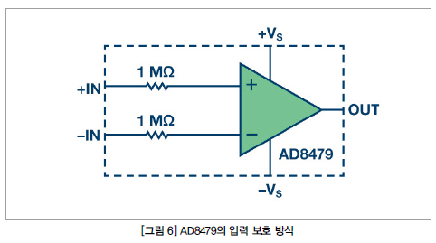 증폭기가 그림 7처럼 구성되어 있거나 전원에 연결된 다이오드가 입력을 보호한다면, 입력 전류는 다음 식 1에 따라 제한될 수 있다.