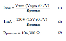 다음은 공급 전압(Vsupply)이 +/-15 V, 입력 전압(Vstress)이 최대 +/-120 V이고 입력 전류를 1 mA로 제한할 때 증폭기 보호를 위한 계산의 예를 보여준다. 식 1을 이용하면 이러한 입력 값을 이용해 다음 식 1-3을 계산할 수 있다.