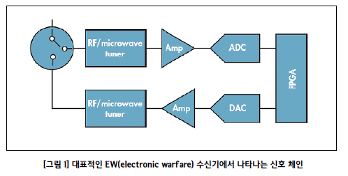 그림 1은 간단한 EW 시스템을 보여준다. 이 시스템의 주요 특징이 바로 RF 수신기로, 이 수신기는 주파수의 다운컨버전(downconversion) 및 조사(interrogation)가 필요한 해당 주파수 대역의 선택에 사용된다. 여기에서 ADC는 신호를 아날로그 영역에서 디지털 형태로 변환하는 데 사용되며, FPGA(typ.)와 같은 DSP 엔진은 해당 신호 용량을 감지 및 결정하고 분석해 관리하도록 구성된다. 또한 DRFM과 EA 시스템에는 고속 DAC를 갖춘 대응 송신 신호 체인(corresponding transmission signal chain)이 포함된다.
