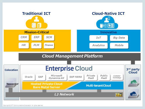 NTT컴은 기업들이 창의력 발휘, 빠른 성장과 시장 지배력(market leadership) 유지를 위해 사업 다방면에 걸쳐 디지털 기술을 적용하는 디지털 변환(digital transformation)의 복잡한 요건을 충족하도록 자사의 강화된 엔터프라이즈 클라우드(Enterprise Cloud, http://goo.gl/YQYsl7)를 출시하고 있다. 디지털 변환의 시대에 기업들이 당면한 과제는 두 가지이다. 한편으로 기업들은 보다 효과적인 ICT 운영 및 비용 최적화를 위해 기존의 ICT를 클라우드로 이동시킬 방법을 찾고 있고, 다른 한편으로는 모바일, 소셜, 빅 데이터, 사물인터넷(IoT) 및 기타 디지털 기술을 통해 구동되는 클라우드 고유의(Cloud-Native) 애플리케이션을 배포하고 신속한 혁신을 지원하는 소프트웨어 개발 방법의 하나인 개발/운영(DevOps) 문화로 변화하고 있다. NTT컴의 강화된 엔터프라이즈 클라우드는 이러한 과제를 충족하기 위해 네트워크 연결, 코로케이션(collocation) 서비스 및 제3자 클라우드와 더불어 기존 ICT 및 클라우드 고유 ICT 모두를 위한 포괄적 제공한다.