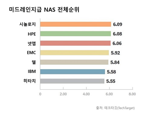 네트워크 스토리지 NAS(Network Attached Storage) 분야의 세계적인 기업 시놀로지(Synology, www.synology.com)가 미드레인지급 NAS 시스템 조사에서 세계 1위를 차지했다. IT 마케팅 전문업체인 테크타깃(TechTarget)에서 실시한 ‘제10회 NAS 시스템 품질 어워드 조사’에서 시놀로지는 HPE, 넷앱, EMC, 델, IBM 등 여러 엔터프라이즈급 스토리지 기업보다 월등히 앞선 것으로 나타났다.