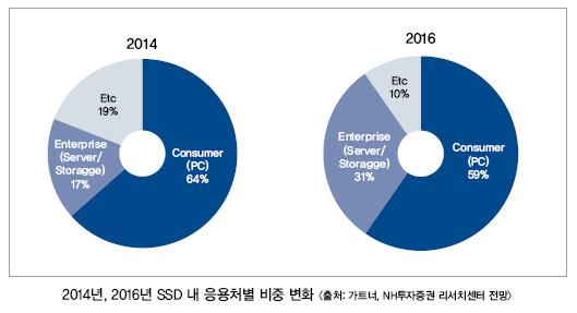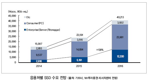 특히 이세철 연구원은 “최근 스토리지 서버 업체인 EMC가 SSD를 전면 채용하기 시작하면서 엔터프라이즈(서버, 스토리지) 부분에서 SSD 수요가 확대될 것”이라고 전망했다. 또한 2016년 전 세계 SSD 수요는 1 GB 기준으로 402억 개로 전망되고 있으며, 이 중 엔터프라이즈용 SSD는 2014년 17 %에서 2016년 31 %로 확대되면서 약 123억 개에 달할 것으로 전망했다. 성장률 역시 SSD 응용처 중에서도 가장 높은 138 %의 성장을 예상했다.