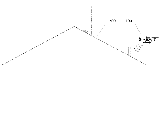 〈Fig.1〉은 UAV 100이 솔라 사이트 평가를 수행하는 그림이다. UAV 100이 기동하고 비행하면서 지붕인 200에 있는 지붕꼭대기에 설치될 태양광 파넬 등을 위해 여러 후보 사이트들을 평가하는 것이다.