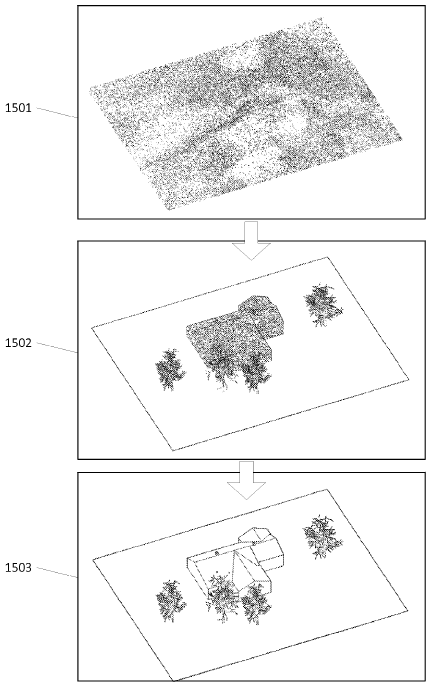 〈Fig. 15〉는 바로 라이다 센서가 수집한 포인트 구름으로부터 생성한 3차원 모델들이다. 1501은 솔라 사이트의 초기의 산재한 포인트 구름(sparse point cloud)이고, 1502는 밀집된 포인트 구름(dense point cloud)이며, 1503은 1502로부터 생성된 저 다각형(low polygon) 3차원 모델이다.