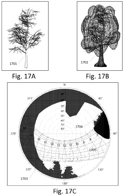 그런데 실제 상황에서는 이들 객체들을 줄이면 정확도가 떨어지기 때문에 그대로 포함하는 경우가 많다. 그 한 방법으로 태양의 움직임(경과)은 동에서 서로 반구형으로(Hemispherical) 이동하기 때문에 이들 나무들(bushes, shrubs)과 가지들(branches)과 잎들(foliage)이 영향을 줄 수도 있다. 바로 Fig.17A~17C의 첫째 1701은 카메라가 잡은 나무이고, 1702는 이에 상응하는 라이다가 잡은 메시 모델(Mesh model)이며, 1703은 반구형의 뷰쉐드(Hemispherical viewshed, 1703)에 반영된 아웃라인(1704)으로, 그 결과 1705의 어두운 지역(dark area)에 의해 그늘로 반영되어(shading reflected) 나타난다. 반구형의 뷰쉐드란 한 지점에서 볼 수 있는 지역으로, 이때 산과 나무와 같이 태양을 막는 장애물이 고려되는 것이다. 다시 말해 태양의 경과를 반영하는 것이다.